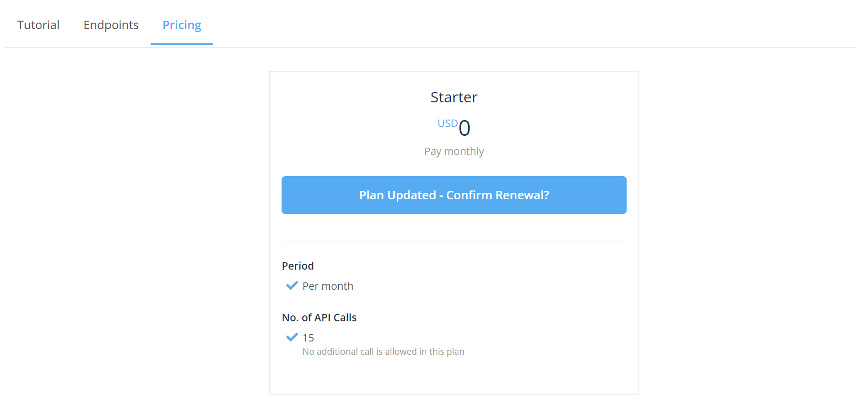 If you wish to renew your subscription plan, please navigate to the API pricing page on the API Portal and click on the Plan Updated - Confirm Renewal? button.